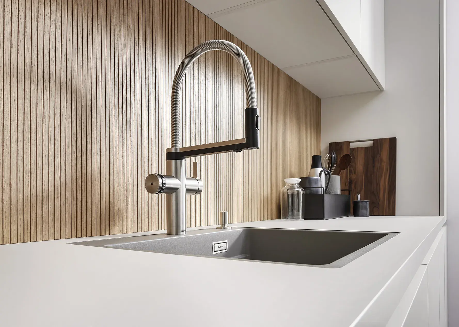 Im Mittelpunkt der Küche: der Wasserplatz. Trinken. Vorbereiten. Reinigen. Das alles ist in der BLANCO UNIT perfekt vereint. Die BLANCO UNIT ist eine Einheit am Wasserplatz. Sie macht das Leben leichter, rationeller und ist zudem stilvoll gestaltet. Integrieren Sie in Ihrer Küche eine in sich besondere, abgestimmte Lösung, die Sie im Alltag bei der Nutzung von Armatur, Spüle, Abfall- & Organisationssysteme optimal unterstützt. Entdecken Sie das umfassende BLANCO Sortiment sowie das einzigartige Konzept der BLANCO UNIT. Neu und besonders innovativ: das Wassersystem BLANCO CHOICE in Kombination mit der BLANCO UNIT-App.