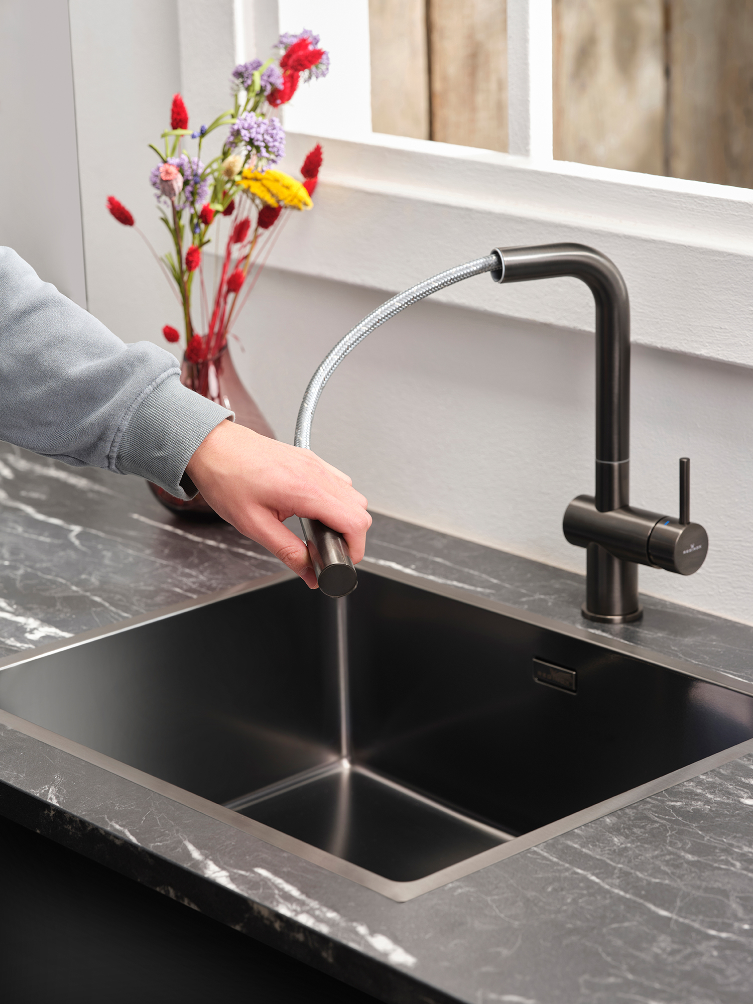 REGINOX Armaturen gibt es in denselben Farbgebungen wie die SpĂŒlbecken und in mehreren Formen und AusfĂŒhrungen: rechtwinklig, bogenförmig, L-förmig, mit Schlauchbrause bzw. Auszug-Auslauf sowie mit langem, leicht gebogenem Hebel dafĂŒr bestimmt, auch mal einfach mit dem Ellenbogen bedient zu werden.
